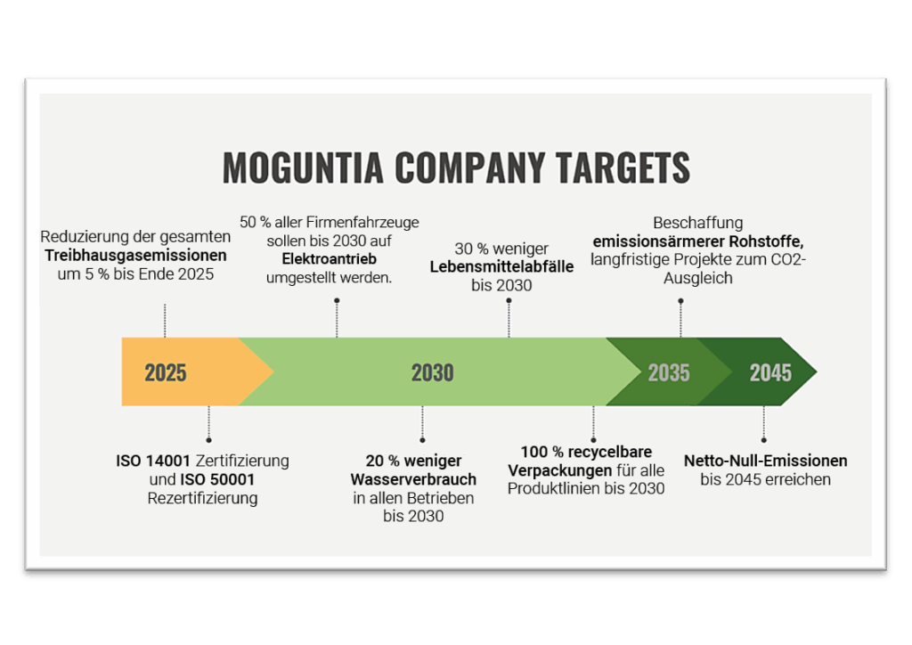 Im Rahmen unserer langfristigen Nachhaltigkeits-Roadmap hat Moguntia zudem messbare Ziele definiert, die unsere Verantwortung als Hersteller und Partner widerspiegeln – im Einklang mit globalen Nachhaltigkeitszielen und den Erwartungen unserer Kundinnen und Kunden.